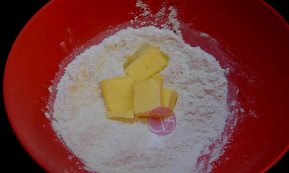 - To prepare the crust, In a mixing bowl add flour, sugar, salt and butter. Mix it well until it resembles bread crumb.