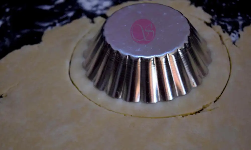 Preheat the oven to 180 °C. On a floured surface, roll the dough into a sheet about ¼ inch in thickness. Cut circular discs out of it (larger than the diameter of pie pan). Brush each pie mold with butter. Transfer these cut-outs into a greased pie tins.