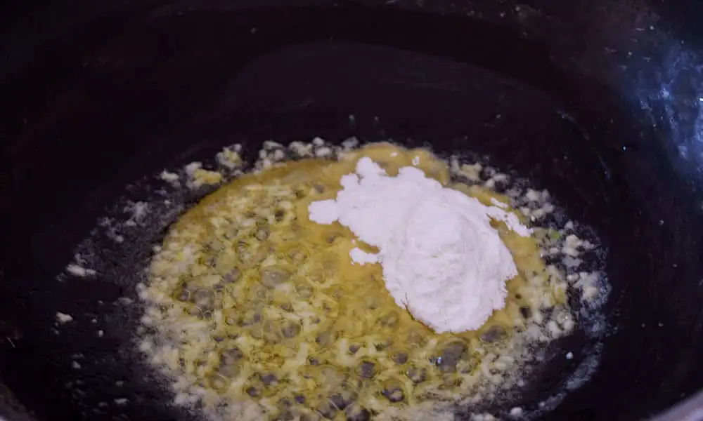 • In a large pan melt butter over medium heat. Add minced garlic to it and sauté for 1 min. Add wheat flour and cook for 3-4 minutes.