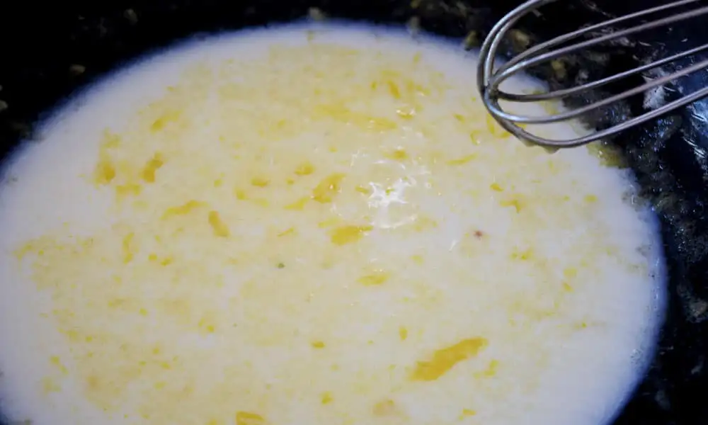 • Add milk to the mixture and using a whisker, whisk it to avoid lump formation.