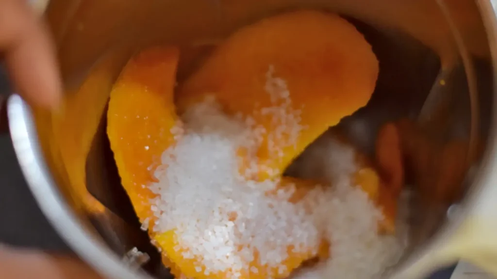 - Blend all the ingredients well into a puree. Ensure the puree is smooth with no crystals of sugar and no chunks of mangoes remaining.