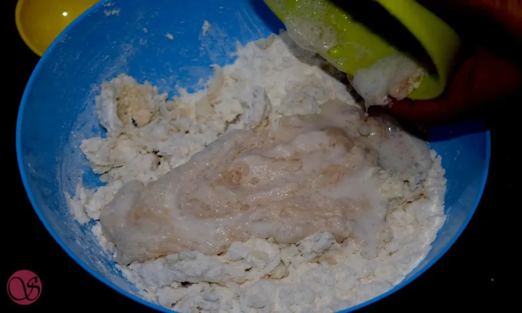 - In a large mixing bowl, take flour, milk powder, salt, prepared water roux (Tangzhong) and activated yeast solution. Start kneading the dough with milk.