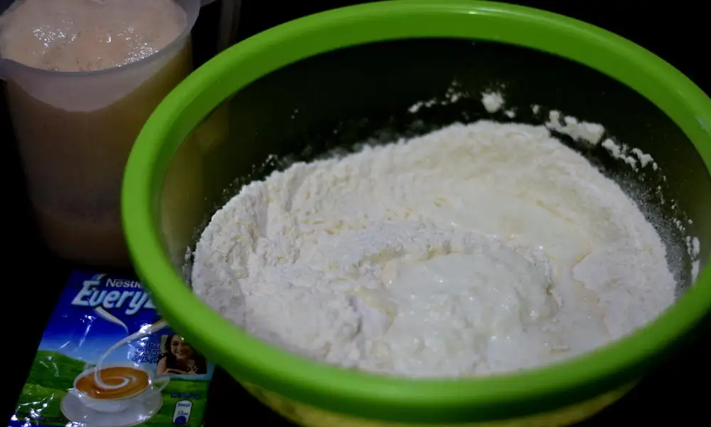 In a bowl take flour, salt, cream, and milk powder. Mix everything.