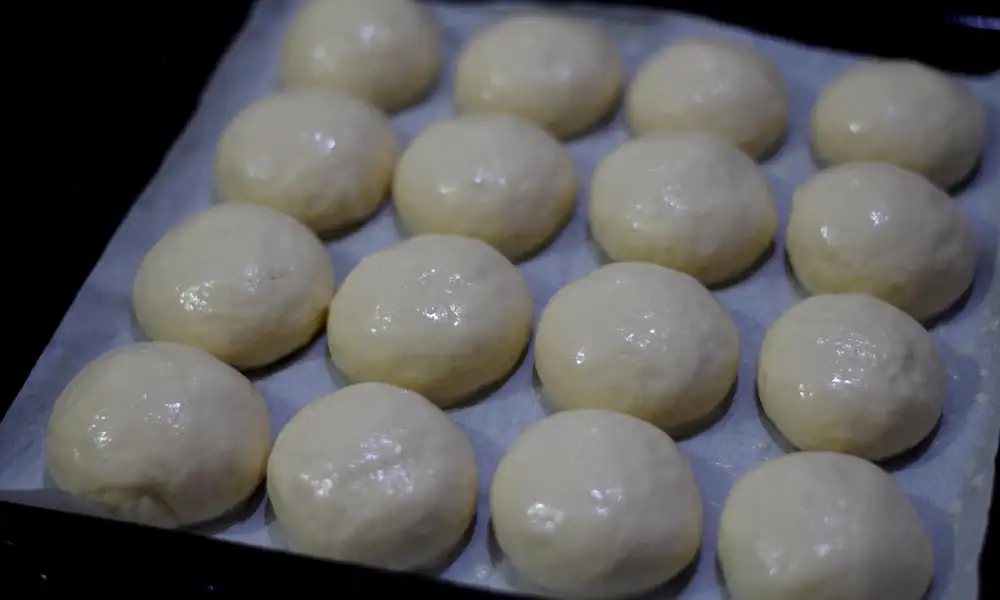 Divide the dough into equal portions of 50-52 gram each. I got 16 portions. Shape them round and place on a greased baking tray. Leave some space in-between. Cover them again with a kitchen towel and let them rest until they double in volume.