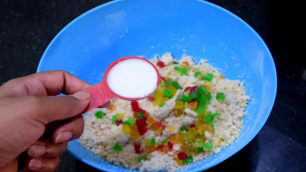 Start mixing all the ingredients until you get a breadcrumb-like texture. Add tutti frutti and 2 tbsp milk to bind the dough.