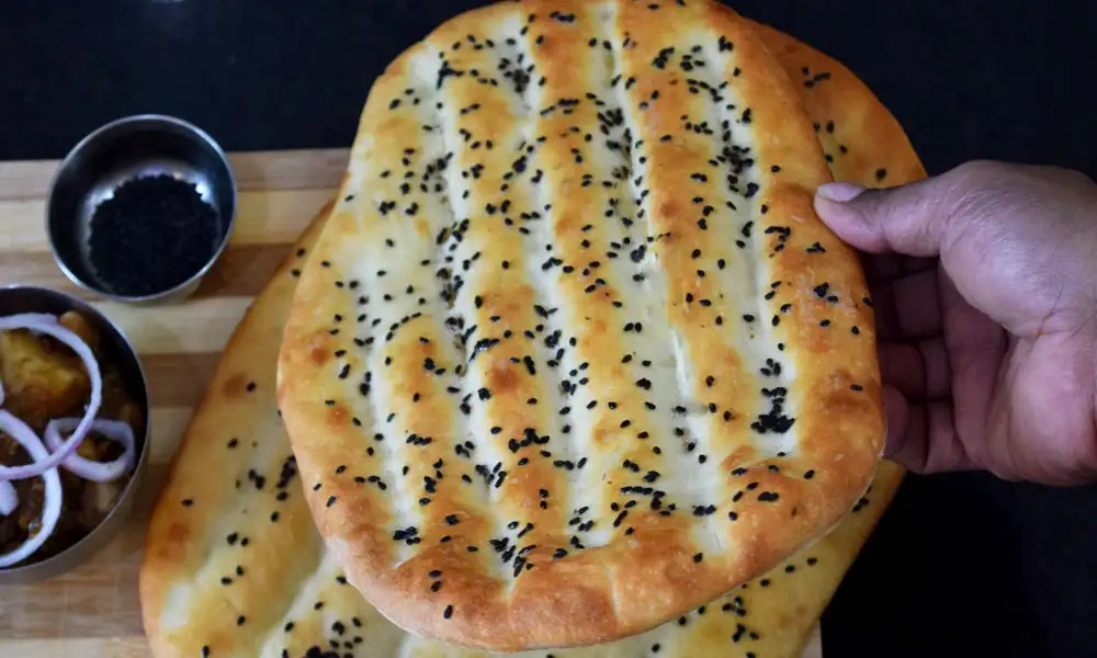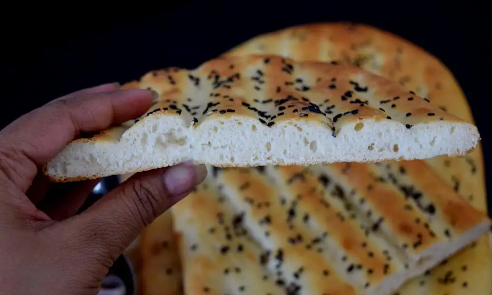 After 10 minutes, slice the bread and serve with your choice of gravy. This bread is known as the thickest flatbread. It has the rustic crust with a soft and chewy crumb. You can store this bread in an airtight container in the refrigerator for a couple of days.