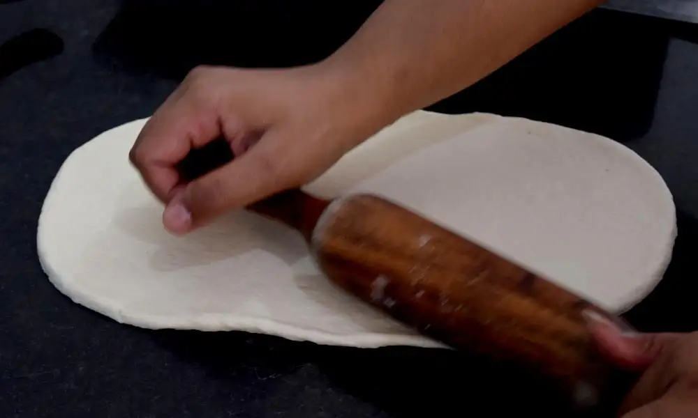 Lightly dust the counter with flour and roll the dough into a rectangular sheet, approximately 13 inches long and 5 inches wide. Transfer it to a greased baking tray.
