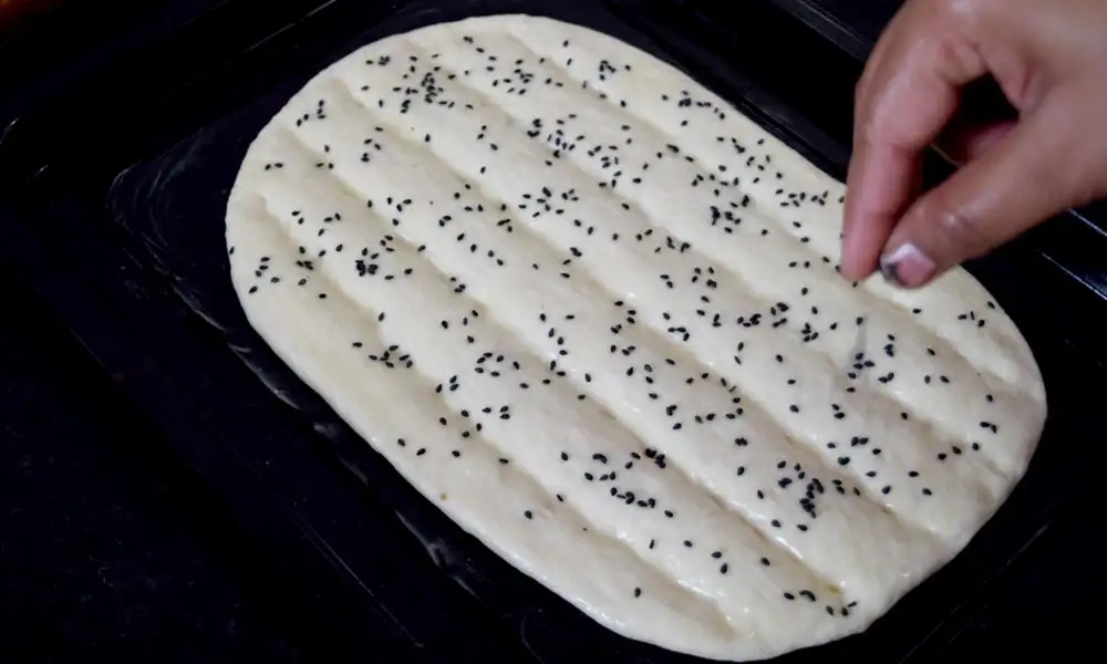 Rub half of the prepared flour paste on the dough. Sprinkle Nigella seeds on it. Gently press down the seeds. Let the dough rest for 10-15 minutes.