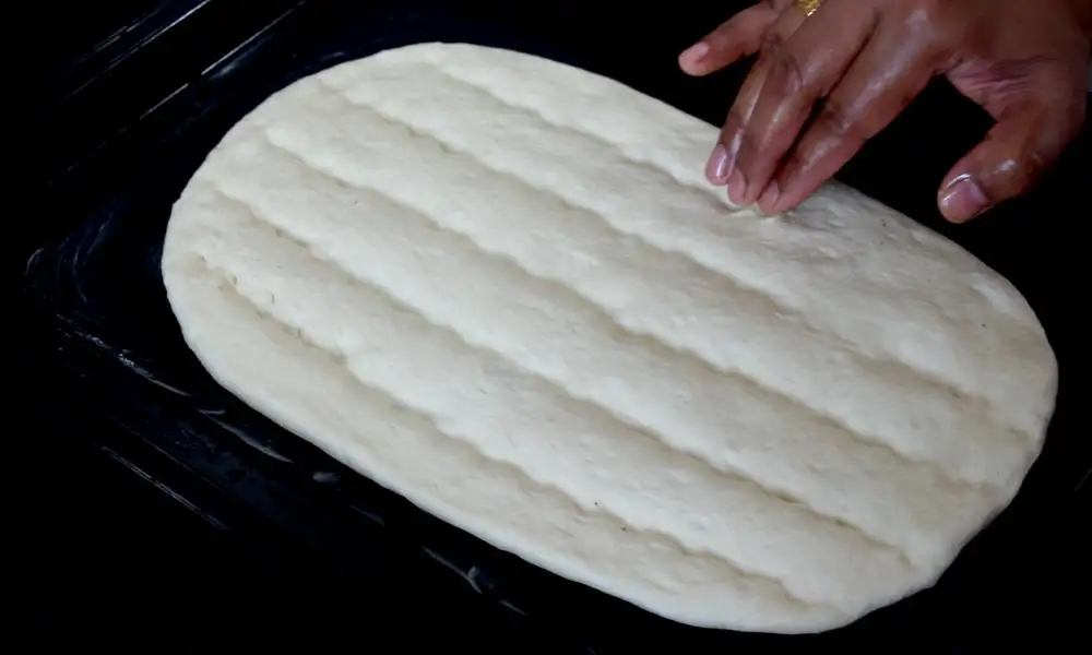 Use your fingers to poke down the length of the loaf, forming 5 deep ridges lengthwise as shown in the picture. To make these indentations you can use back of a knife or spatula. Ensure that the indentations are deep enough, otherwise, the bread will puff up.