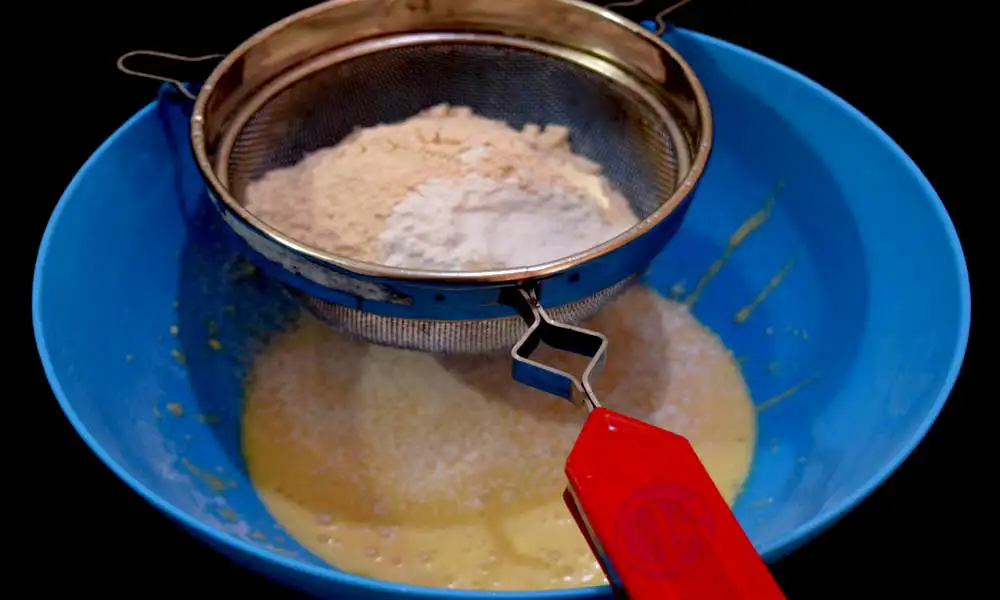 - Using a sifter, sieve flour, baking powder, baking soda, and salt.