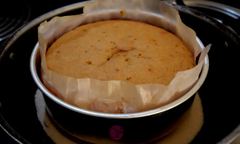 - Once the cake is completely baked, switch off the flame and take out the baking tin. Let it rest for 5 minutes.