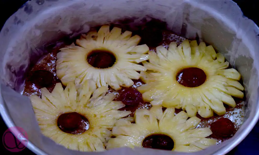 - Line a 7 inches pan with parchment paper. Sprinkle brown sugar at the base of the pan. Place pineapple slices and cherry.