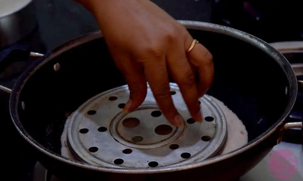 - Place this baking tin on the stand (places inside vessel on a gas stove) and close the lid.