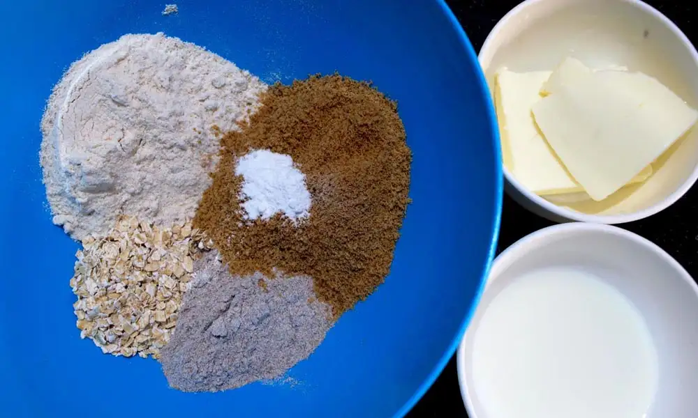 In another mixing bowl, take wheat flour, oats, millet flour, jaggery powder, and baking powder. Mix all the dry ingredients well.