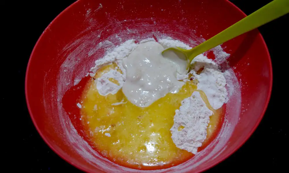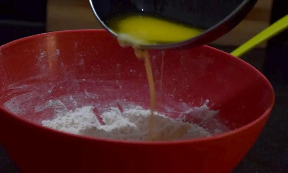 - Add melted butter solution along with starter to the dry ingredients. Start mixing.