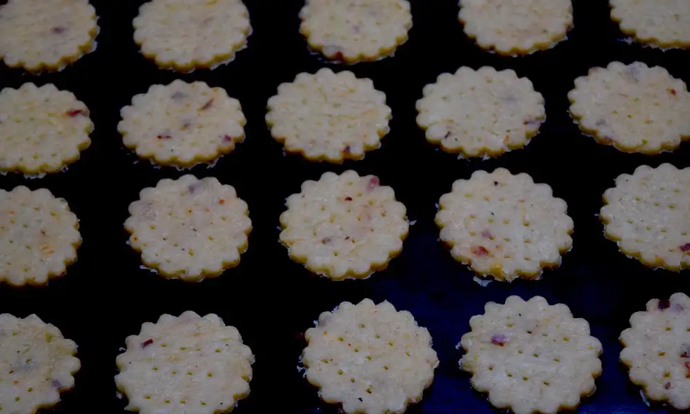- Using a cookie cutter, cut evenly shaped crackers from the sheet and place them on a greased baking tray.