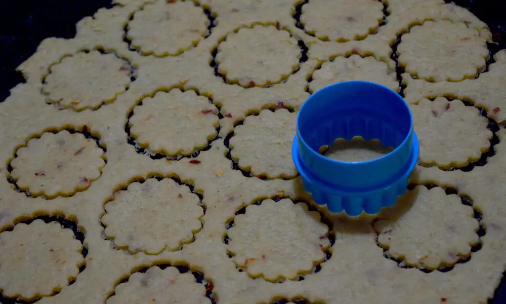 After 30 minutes, take the dough out from the refrigerator and roll it into a thin sheet of a ¼ inch thickness. Using a cookie cutter, cut crackers out of it.
